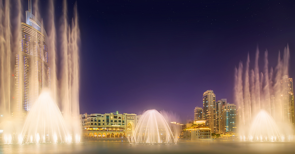 世界最大級の噴水ショーで噴水に合わせ、さまざまな音楽が演奏される様子はまるで水が踊っているようです。ショーは毎日午後6~11時までの間、30分ごとに上演され無料で見られます。観賞場所はいくつもありますが、ゆっくり見たい人には有料の「ボードウォーク」がおすすめ。ファウンテンから約9mの距離にある全長272mの水上のプラットフォームを歩きながら、壮大な光景を間近で楽しめます。またドバイモールのエントランス6から出ると目前にスークアルバハールへの橋があります。その橋上から眺めるとブルジュ・ハリファが背景になり絶景の噴水のショーが見られます。