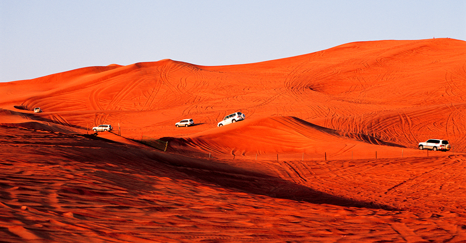 砂漠の中を4WD車で豪快にドライブするデザート・サファリ。砂の上を走り上下に揺れる車中は、絶叫マシンよりもスリリング。夕暮れ時、地平線に真っ赤な太陽が沈み、徐々に色を変えていく空や砂の光景には思わず息をのみます。途中、女性はヘナペインティング、男性は水タバコなどアラブならでは伝統文化を楽しむこともできます。砂漠では日中と夜の温度差が大きく、出発時は暑くても帰りに寒くなることがあるので薄手の上着などをも持っていくと良いでしょう。また風で砂が舞うことも多いのでバッグはしっかりと口が閉まるものを、靴は砂の中でも歩きやすいサンダルをおすすめします。