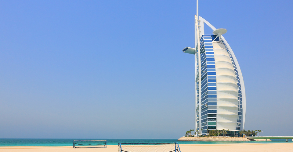 アラブの伝統的な船「ダウ船」の帆をイメージして作られたドバイを象徴するホテルのひとつ。全202室すべてがメゾネットタイプ(2階建ての部屋)になったスイートルームで、純金が散りばめられた豪華な造りになっています。ゲストはまずロビーでアラビア風のコーヒーとデーツ、そして優雅なバラの香りのおしぼりでお出迎え。その後、専用エレベーターで客室へ向かいます。各フロアにはバトラーが待機する専用のデスクがあり高級ホテルの名にふさわしいおもてなしをしてくれます。またホテル上部の「アルムンタハ(頂上・究極という意味)」という名を持つ展望レストランやモザイクタイルを散りばめた豪華なスパなどで優雅なアラブの王族気分を味わってみるのもおすすめです。