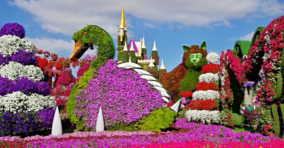 ドバイの砂漠エリアにある世界最大級のフラワーガーデン。毎年11月下旬~5月中旬の期間限定で開園しており期間中は多彩な花々が見られます。おすすめは過ごしやすい気温の中で特に花が美しく咲く1~2月。「世界最大の垂直庭園」として認定されており、72,000平米の広大な敷地にはさまざまな花の展示物があります。「垂直」庭園の名の通り、ただ単に地面に花を植えるだけではなく園内は花で彩られたお洒落なオブジェが満載!ドバイならではの贅を尽くした飾り付けに目を奪われます。デザインは毎年変わるため、何度訪れても楽しめます。