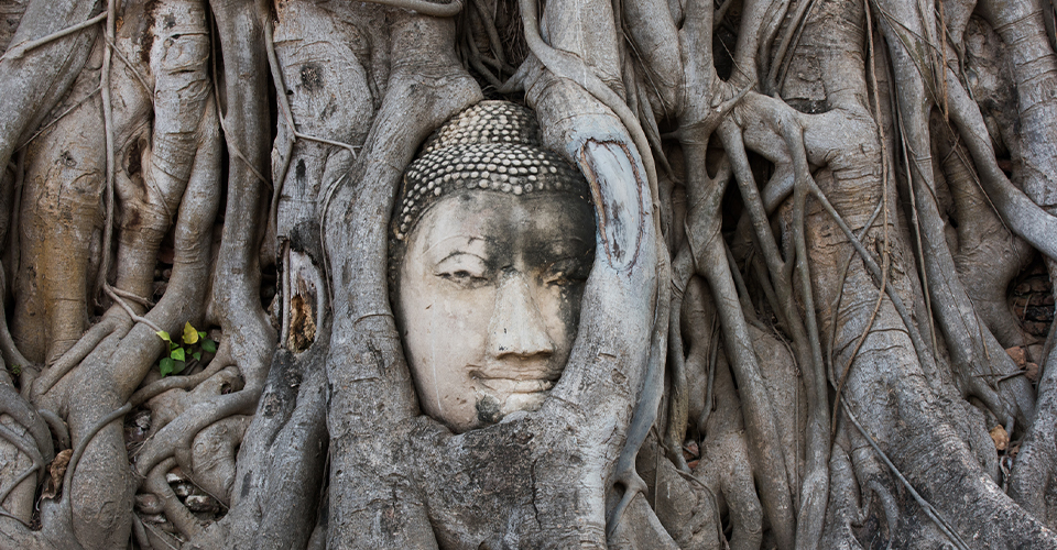 1991年に世界遺産に登録されたアユタヤ遺跡。1351年から1767年までの417年もの間、アユタヤ王朝の首都として栄えた跡が公園内に点在しています。中でも見逃せないのが、ワット・マハタートです。この遺跡は仏頭が木の根に取り込まれ、神秘的な姿をしています。かつて、アユタヤ王朝がビルマ軍に侵攻された際、切り落とされた仏像の頭に木の根が絡みつき、このような姿になりました。一緒に写真を撮る際には、この仏頭よりも自分の頭が高い位置にこないようにするのが礼儀となっていますので、ご注意ください。