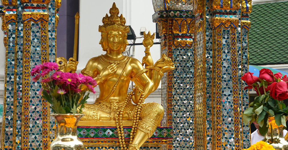 バンコクのパワースポットとして最も有名なエラワン廟。ここに祭られているのはブラフマーという神様で、顔が4面あるヒンドゥー教の宇宙の創造を司る最高神です。どんな願いでも叶えてくれるというこの場所でお参りをするには、まず花と線香とろうそくのお参り用のセットを購入します。準備ができたら正面入口から時計回りに4カ所、ブラフマーの顔が向いている場所で手を合わせ、お願い事をします。その際には、膝をついて座り、手を合わせるとよいようです。その後にお花とお線香を所定の場所に置いていきます。みなさんは何をお願いしますか?