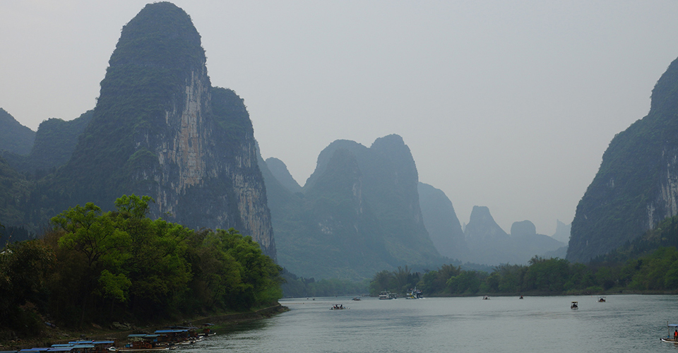 漓江は桂林の市街地を流れ、珠江に合流する全長426kmの川です。川の水質がよいため、水草や魚が見えます。竹江から陽朔までを下りて行く漓江下りは、桂林山水を堪能できる人気の観光コースです。冠岩という洞窟や、桂林のシンボルとして親しまれる象鼻山、ラクダのような形をした駱駝山など、漓江ならではの景観が広がります。雨季になると、雨でかすんだ両岸の奇峰が水墨画のような絶景を作り出します。終着点の陽朔では、街を散歩しながら目の前に迫る奇峰や奇宕を満喫できます。