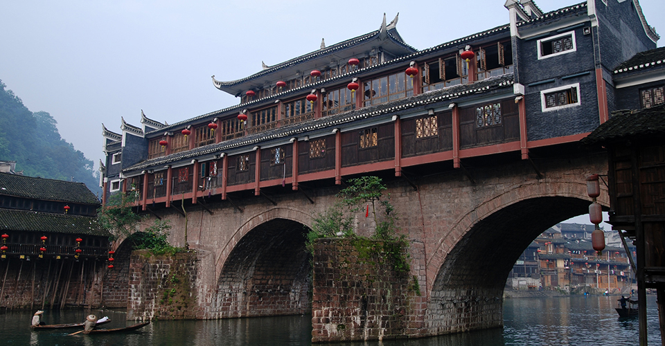 鳳凰古城は、トゥチャ族とミャオ族が多く居住し、彼らの伝統的な家屋や文化に触れられる地域です。石畳の路地を歩くと銀細工や工芸品などの様々な土産物店が軒を連ね、観光客でにぎわいます。沱江に掛かる2階建ての虹橋はシンボル的な存在。2階は町並みを一望する展望室になっていて、夜はライトアップされた夜景を楽しめます。