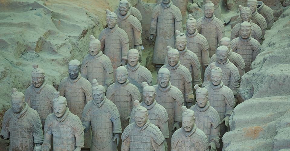 兵馬俑は、秦の始皇帝陵の副葬坑として造られた、シルクロードの東の起点、西安にある世界遺産です。約8000体の等身大の兵士と馬の人形は、歴史的価値の高さから「世界の八番目の奇跡」と称賛されています。全ての俑は敵国が存在した東方に向かって配置されているのが特徴で、一体一体顔の表情や髪型や服装が異なります。歩兵、騎兵、戦車の3種類に分類されており、その規模と精密さから、始皇帝の軍団が広範な民族の混成部隊であったことが分かります。