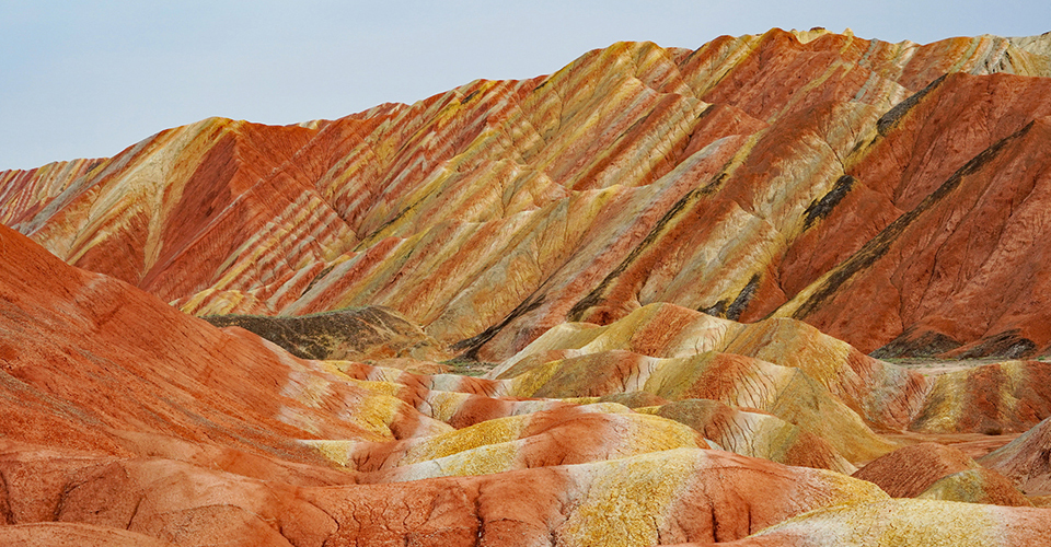 張掖はマルコ・ポーロが過ごしたとされる、シルクロード河西回廊の街です。そこから約50km離れた場所に、縞模様の地層が見られる張掖丹霞地貌というカルスト地形があります。この地層には様々な鉱石が含まれていることから、陽光により色が変わります。赤、黄、白、青、緑など色彩の美しさから七彩山とも称されます。見どころは七彩霞峡、七彩塔、七彩屏、火海、七彩練、瑠璃峰、七彩瑚、七彩菇、大扇など11ヶ所あります。展望台から、色とりどりの山なみをはじめ、川や田園、村など、迫力のある景色を堪能できるスポットです。