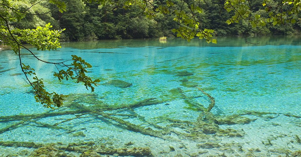 九寨溝は、山あいにある美しい湖沼群です。標高2000m以上に位置する高地にあり、鏡のように澄んだ湖と周囲の山々が織りなす景色が年間を通して楽しめます。特に五花海は九寨溝を代表する神秘的な景観。石灰水の影響でより透明度が高く、湖底の折り重なる倒木までしっかり見ることができます。春夏には緑、秋には紅葉、冬には雪景色が湖面に映り込み、四季折々の美しい風景を満喫できます。溝内は環境保護のため、専用のグリーンバスで行き、湖周辺の遊歩道を散策するスタイルが一般的です。