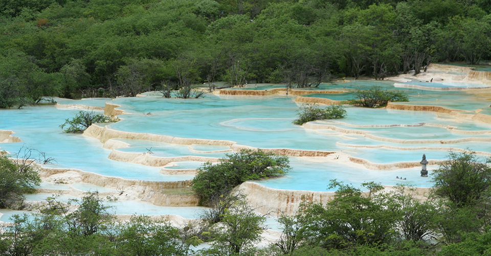 黄龍は、四川省奥地の森林や雪山に囲まれた、美しい景色が広がる渓谷です。乳白色の石灰棚がうろこのように連なり、見る角度と時間で色や表情を変え、色とりどりの景色を楽しませてくれます。80あまりの風景を映し出す彩池が集まる明鏡倒映池、透き通った池に樹木や花が咲き巨大な盆栽にみえる盆景池などがあります。最も有名な五彩池は、湖面が緑、青、黄色、茶色へと変化し、晴れの日には金色に輝きます。ロープウェイで山上エリアまで上り、電動カートに乗り換えて約2kmの距離を移動できるのがポイントです。そこからは遊歩道となりますが、木道や階段が整備され、ゆっくりと歩きながら美しい景色を堪能しましょう。