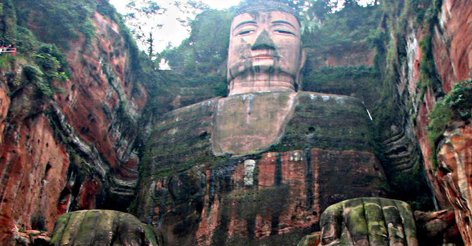 峨眉山風景名勝区の一部である楽山大仏は、峨眉山とともに世界遺産に登録されています。栖鸞峰の岩壁に彫られた石刻座仏で「山が一体の仏、仏が一つの山」といわれるほど圧巻のスケールです。足の甲だけでも幅約8.5mあり、約100人が座れるとか。楽山大仏は桟道を登って行くほか、岷江を渡る遊覧船から楽山大仏の全体を見学してもよいでしょう。