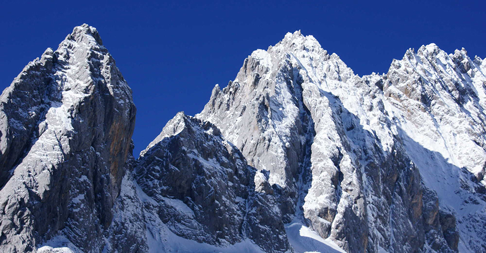 玉龍雪山は13の峰が連なり、最高峰は標高5596m。北半球の最南端に位置し、万年雪を冠する山です。その雄姿は麗江の各所から眺めることができますが、観光地として整備されているのでバスとロープウェイを乗り継いで登ってみましょう。ロープウェイに乗ると高原、森林から氷河へと移り変わる景観を楽しめます。標高4506mの氷河公園駅を降り、遊歩道を通って展望台まで歩くと全長約2.7㎞にわたって氷河の絶景が広がります。