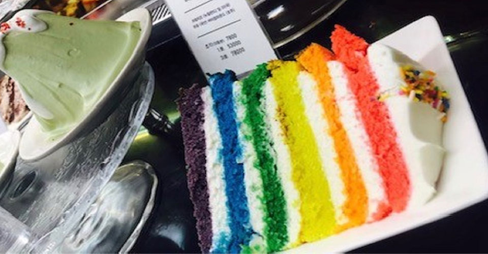 見た目のインパクトが凄い、レインボーケーキ!日本でも話題となりました♪見た目を見ると、、体に悪そうな印象ですが、、このレインボーの着色料は、天然由来の花や野菜から摘出したものを生地に練り込んで作っているそうなので、安心ですね♪弊社韓国担当スタッフも気になり、「DORE DORE」というレインボーケーキ発祥のお店で味わってみたところ、クリームが甘さ控えめで生地もシフォンケーキのようにふんわりしていて思ったより食べやすく美味しかったです♪韓国の写真映えスイーツが気になる方は必見です!