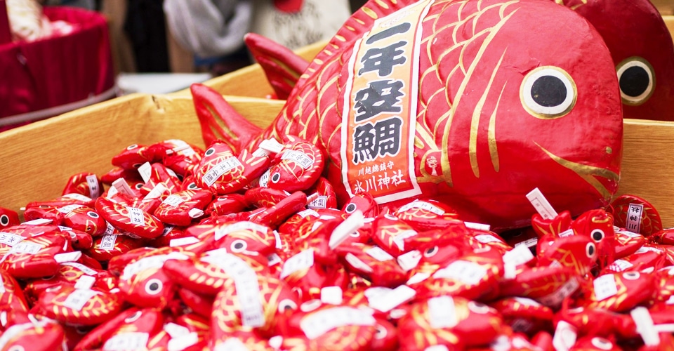 川越熊野神社の御社紋は、熊野大神の使いの三本足を持つ「八咫烏(やたがらす)」。夜明けを呼ぶ鳥、または太陽を招く鳥ともいわれており、霊鳥として広く信仰されています。「八咫烏」をシンボルマークに持つ公益財団法人日本サッカー協会公認の「必勝お守り」もあることから、開運を願う人や、勝負事を控えた人にもオススメです。また、毎年12月3日に開催される名物の「川越酉の市」には、熊手などの縁起物を求めて大勢の人々が集まり賑わいをみせています。