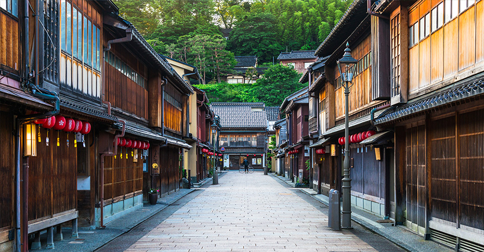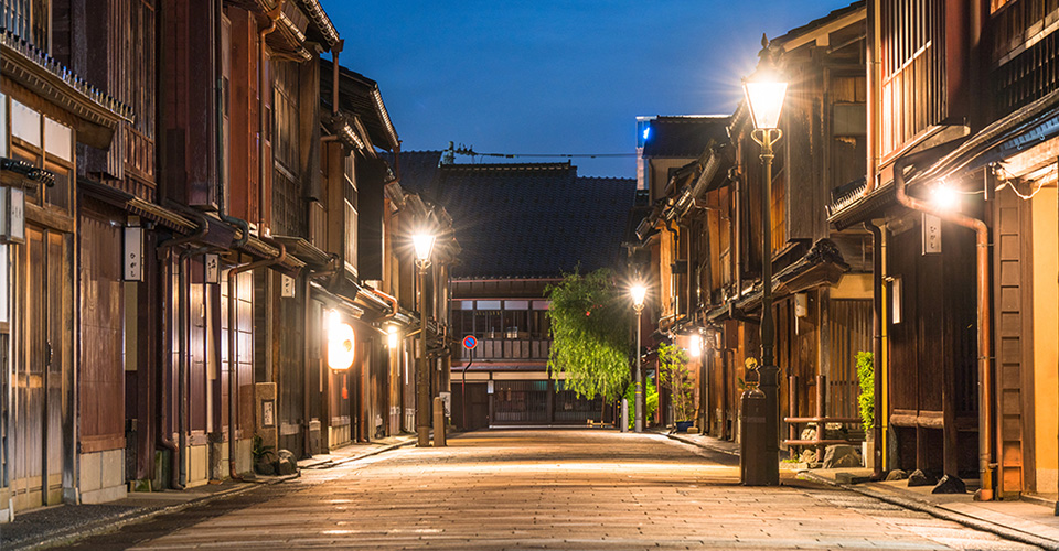 金沢市内を流れる浅野川、その東岸に多く立ち並んだ多くの茶屋は、後に大規模な区画整理により、きちんと整えられた街並みとして生まれ変わりました。これが現在も残るひがし茶屋街の起源です。南北約130m、東西約180m、総面積約1.8haに及ぶ地区内にある140の建造物のうち、その2/3は伝統的建造物。日暮れ時には、伝統的な茶屋様式で建てられた町家のあちこちから、三味線や太鼓の粋な音が聞こえてきます。