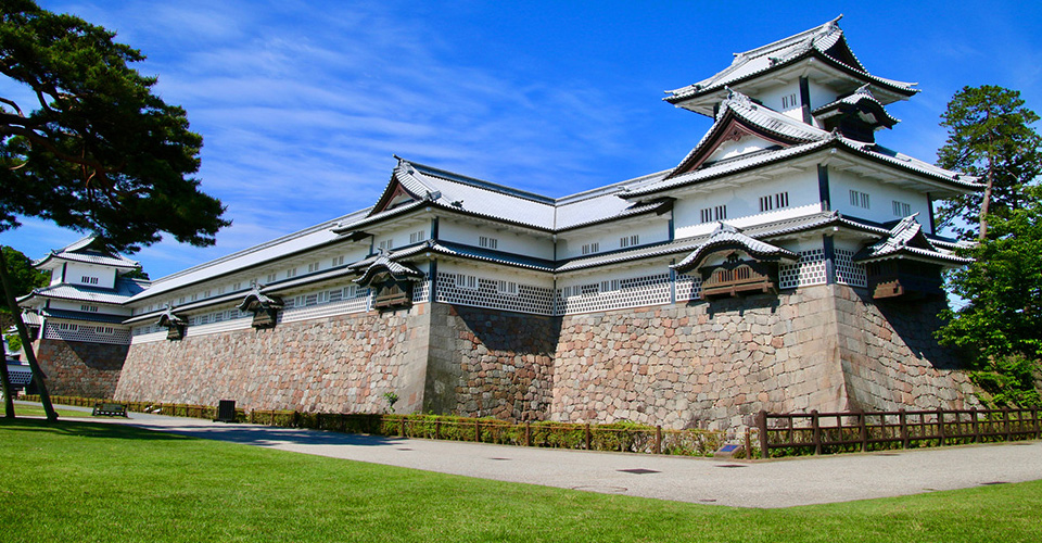 加賀一向一揆の拠点・尾山御坊は、織田信長によって一揆勢が攻め落とされたのち、金沢城と名を改めました。この金沢城には、初代加賀藩主・前田利家が入城。以来、歴代加賀藩主の居城として明治まで存続しましたが、明治14年に発生した火災により、石川門・三十間長屋・鶴丸倉庫を除いて焼失しました。残ったこれらの建物を重要文化財として保護しつつ、2001年より開始された改修工事によって、いくつかの建物が復元されています。