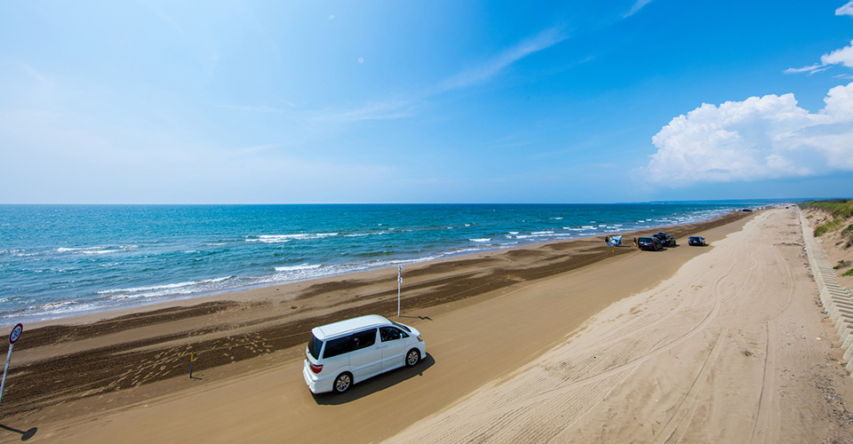 能登半島の付け根にあたる宝達志水町から羽咋市にかけて伸びる砂浜・千里浜は、きめ細かい砂粒によって舗装道路に匹敵する硬さを持ち、一般自動車でもスタックすることなく波打ち際を走行可能。この特性を活かし、日本で唯一、世界でも数ヶ所しかない約8kmの「砂浜の公道」として親しまれているのが、この千里浜なぎさドライブウェイです。