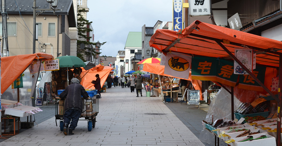 岐阜県の高山朝市・千葉県の勝浦朝市とともに、日本三大朝市の一つに数えられている輪島朝市。その起源は1000年以上前、平安時代中期からと伝えられています。元々は神社の祭礼日に行われた物々交換だったのが、室町時代には毎月4と9の付く日に開催といった具合に頻度が上がり、明治時代に至って、現在と同じく毎日開催されるようになりました。輪島、そして日本海の味と情緒が、約360mの商店街に凝縮されています。