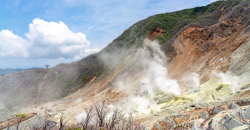 箱根の温泉街近くにありながら、いまだ活発な火山活動がある大湧谷。約3000年前に箱根火山で山崩れが発生し、その際に積もった火山砕屑物が大湧谷の原型に。その後も小規模な火砕流の発生によりさらに火山砕屑物が堆積し、現在の大湧谷が形成されました。赤茶色の山肌、硫化水素の噴煙で枯れた樹木、立ちこめる硫黄の香りなど、森の緑とはまた違った自然の息吹を感じることができます。荒涼とした大地に噴煙が吹き出し硫黄の臭いが鼻をつく、かつては“地獄谷”と呼ばれた景観こそが大涌谷の最大の魅力です。景観を満喫するならロープウェイがおすすめ(※火山ガスの濃度に応じて運転を休止する場合あり)。迫力ある大涌谷の谷底を眼下に空中散歩をお楽しみいただけます。車でもアクセス可能で、高いところが苦手な方でも安心。また、地熱と火山ガスの化学反応を利用した大涌谷名物“黒たまご”はここでしか味わえない出来たてほかほかの一品。ひとつ食べると「7年寿命が延びる」とも言われています。
