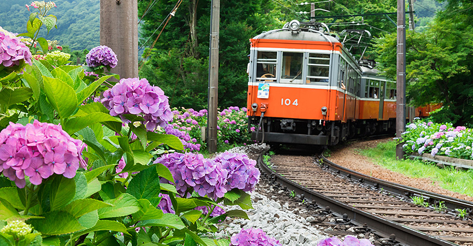 1919年開業の歴史ある電車。箱根登山電車は、古くから箱根を訪れる旅人の“足”として活躍してきました。登山電車の名の通り、始点・小田原駅と終点・強羅駅の標高差は500m以上。山の斜面をジグザグに進む「スイッチバック方式」は、箱根登山電車の名物にもなっており、力強く急勾配を登っていく様子に大人も子供もワクワク感を味わえます。沿線にも見所が多く、塔ノ沢駅のホームにある「深沢銭洗弁財天」や、登録有形文化財でもある「出山鉄橋」は見逃せないスポットです。車窓からは四季を通じて美しい景色を望めますが、紫陽花が咲き誇る夏は格別。見ごろは6月中旬~7月中旬で、夜はライトアップも行われています。