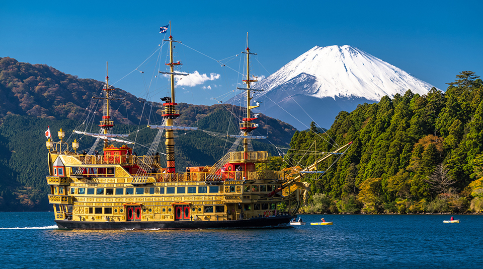 箱根海賊船は、芦ノ湖を遊覧しながら富士山や箱根の景色を楽しめる海賊船型の観光船です。元箱根港・箱根町港・桃源台港を結ぶ運行ルートとなっています。クイーン芦ノ湖、ロワイヤルⅡ、ビクトリーの3隻はすべてコンセプトの異なる豪華な内装が施されています。開放的な展望デッキからは季節ごとの風景や湖面に映る富士山を鑑賞可能です。