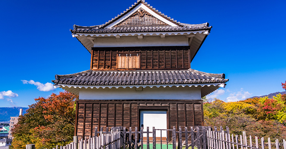 真田昌幸が築城した「上田城」は、1585年から二度にわたって徳川軍を撃退した「上田合戦」が行われた地であり、難攻不落の城として知られています。1600年の関ヶ原の戦いで敗戦し破却されましたが、後に上田藩主の仙石氏によって再建されました。「西櫓」や「真田石」と呼ばれる石垣等、かつての上田城を感じさせる遺構が残っています。「二の丸堀跡」のケヤキ並木遊歩道では、秋になると色鮮やかに上田城を彩る紅葉を観賞できます。