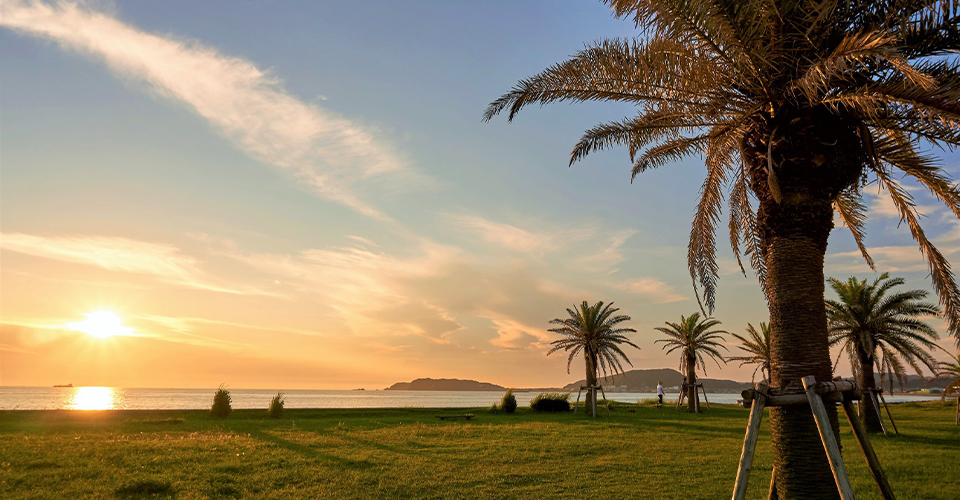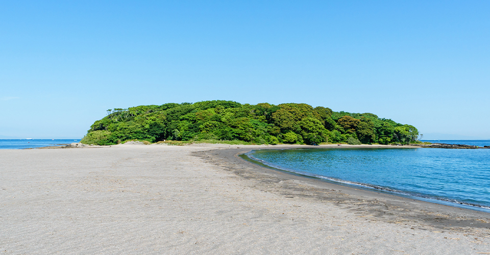 沖ノ島公園は館山市中南部、館山市街の西方にある海浜公園。周囲約1kmの無人島です。海岸と長さ約200mの細長い砂浜でつながっている陸繋島(りくけいとう)という陸続きの島で、もともとは周囲1kmほどの島でしたが、関東大震災の影響で陸続きとなりました。沖ノ島周辺は海水が綺麗で、環境省の「海水浴場水質調査」で毎年最高レベルのAAランクを獲得。海水浴・ビーチコーミング(貝や石などの漂流物を収集すること)で人気があります。またサンゴ生息の北限としても有名で、素潜りやシュノーケリングも楽しめます。