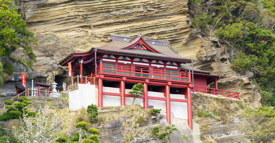 御本尊は「大日如来」と観音堂の背景の崖に刻まれた「十一面観世音菩薩」で、地元では「崖観音」または「崖の観音」と呼ばれて親しまれています。十一面観世音菩薩は「苦しんでいる人をすぐに見つけるために、頭上に十一の顔を持ち全方向を見守る」観音様で、さまざまな災難・病気平癒・財福授与・勝利などのご利益があるといわれています。本堂脇にある「延命地蔵尊」は人気のパワースポット。「無病息災延命長寿」のご利益があるといわれています。境内では「安房国札第3番大悲殿」「十一面大悲殿」の2種類の御朱印をいただけます。