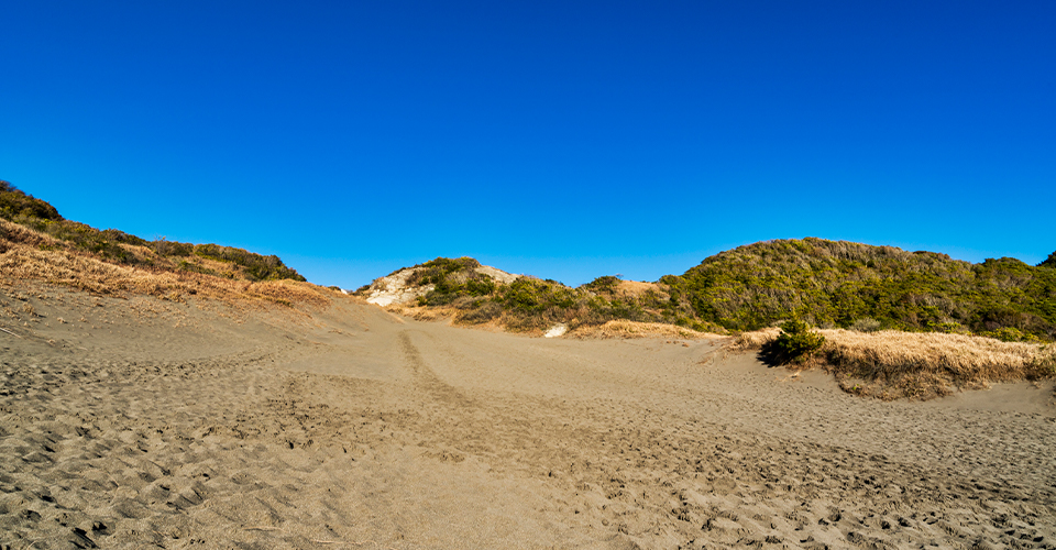 砂山(館山砂丘)は、平砂浦海岸から1キロメートルほど内陸にある海岸から吹き上げられた砂が溜まってできた山。頂上から眺める大島や伊豆諸島は絶景です。砂地の斜面は巨大な遊び場として、ソリやサンドスキーを楽しむことができます。だれでも無料で遊べますが、サンドボード(地元のお店でレンタル可)かスキー用のソリでないとうまく滑らないのでご注意を!砂山付近にはトイレ・自動販売機がないため、水分補給の準備をしてから遊びましょう。