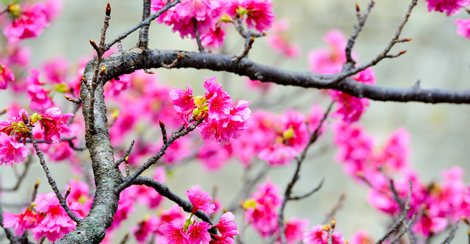 「与儀公園」は那覇市にある大きな公園で、子供からお年寄りまで沖縄県民に広く愛されています。川沿いには鮮やかなピンク色が特徴のカンヒザクラが咲き、那覇を代表する桜の名所です。桜と一緒にハイビスカスなども鑑賞でき、沖縄ならではの風景を楽しめます。また公園内には蒸気機関車が展示されており、沖縄の子供たちに人気。電車ファンの間でも有名なスポットです。