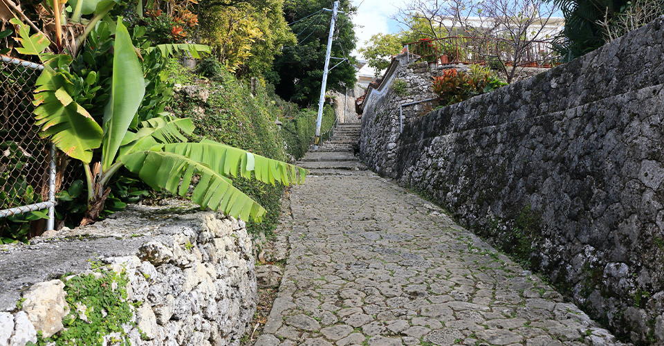 那覇市金城町にある「金城町石畳道」は、尚真王の時代(1477~1526年)に、首里城から南部へ向かうために造られた石畳の道。現存しているのは300mほどですが、両脇には沖縄の古民家が立ち並び、沖縄県指定文化財に指定されています。敷石は大小の琉球石灰岩を組み合わせた「乱れ敷き」で、急な勾配のところでは石の表面に滑り止めの横線の刻みを入れたり、階段をつけたりしているため、歩きやすい靴で散策するのがおすすめ。道の途中にある首里金城町村屋で休憩も可能です。
