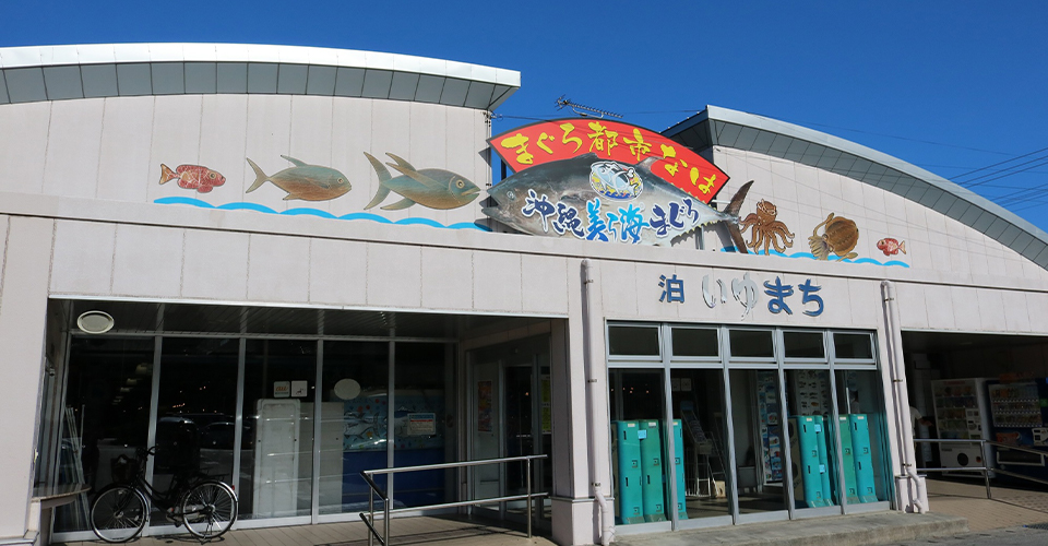 那覇市北西部の泊漁港に隣接する「泊いゆまち」は、地元住民や観光客に人気のスポット。「いゆ」は沖縄の方言で魚、「まち」は店を意味します。23店舗が新鮮な魚介類を販売していますが、「沖縄海鮮問屋」ではお魚を選んで調理してもらうこともできます。「丼・すし まぐろや本舗」はマグロ飯がおすすめ。中でも「三色丼」は、マグロの赤身、中落ち、ねぎとろを一度に味わえる人気メニューです。「イカスミ汁」「アラ汁」などのお吸い物が付いてくるのもうれしいところです。