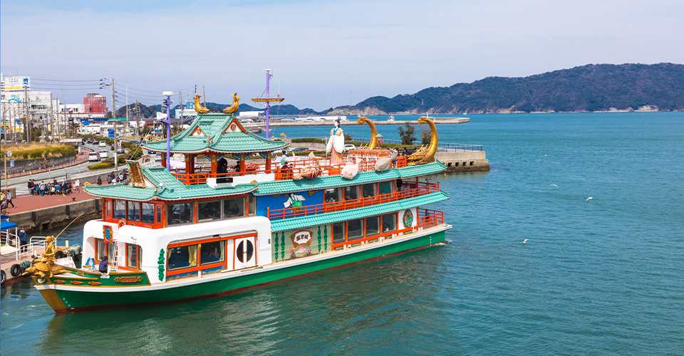 所要時間約50分で鳥羽の名勝三ツ島をはじめとした美しい鳥羽湾を遊覧し、イルカ島にも寄港する遊覧船です。寄港するイルカ島には無料で入園できるほか、園内ではアシカやイルカのショーをはじめ、イルカたちとのふれあい体験が楽しめます。「真珠島・水族館前」と「鳥羽マリンターミナル」から乗船することができます。船舶のひとつ「龍宮城」は、その名の通り龍宮城をイメージした内部装飾や外観をしています。
