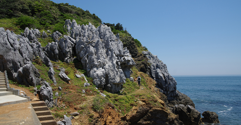 カルスト地形とは、地表に露出した石灰岩が雨水などで浸食されて誕生した地形のことで、日本各地に存在します。こちらは「神島カルスト」とも呼ばれ、神島の東南部に位置します。白い塔にそびえ立つ石灰岩と、海の青さのコントラストが神秘的な雰囲気を漂わせています。下の浜は「ニワの浜」と呼ばれています。この地形がある神島は三島由紀夫の小説「潮騒」の舞台にもなっており、カルスト地形やニワの浜も登場します。