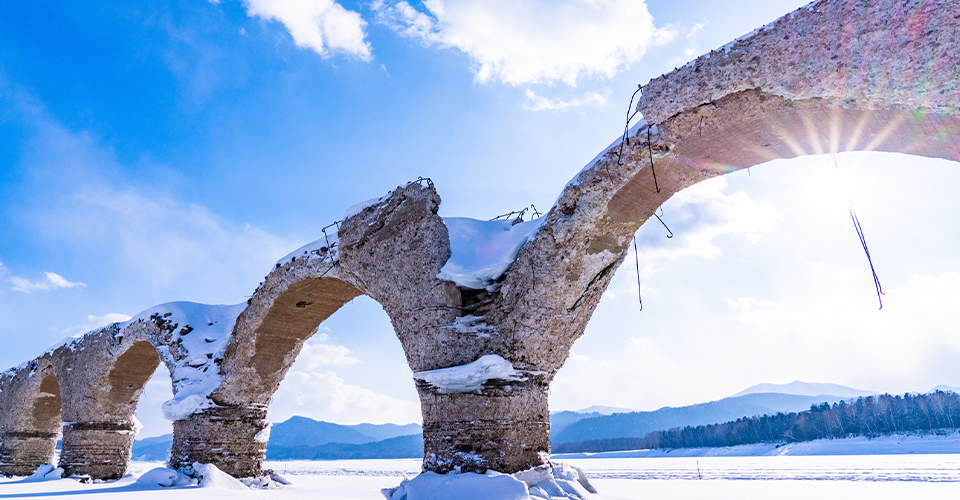 糠平湖は1955(昭和30)年、ダム建設によって造られた人造湖です。人造湖としては北海道で2番目の大きさを誇り、大雪山国立公園内に位置しているため大自然と調和した美しい景観が見られるほか、夏や冬のアクティビティースポットとしても人気。特に冬季はワカサギを目当てに釣り人で賑わうほか、凍った湖の中に気泡が閉じ込められてできる「アイスバブル」が見られることでも有名です。また、糠平湖の水位が下がる時期(1月~8月頃)のみに姿を現す幻の橋「タウシュベツ川橋梁」が見られたり、湖畔には森に囲まれた自然豊かな「ぬかびら源泉郷」があったりとさまざまな楽しみ方ができる観光スポットです。