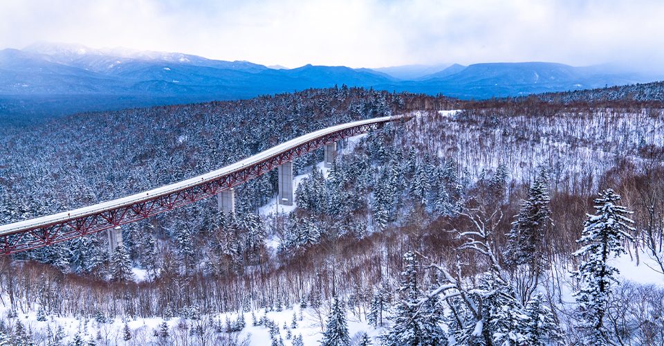 三国峠は標高1139mに位置し北海道の国道の中では一番の標高を誇ります。裾野には大樹海が広がり夏は深い緑、秋は黄色く色づいた紅葉など季節ごとの景観が迎えてくれます。早朝の時間帯、気象条件が合えば雲海が発生することもあり、樹海を覆うさまは壮観のひと言。その展望台の脇にある「三国峠café」は木のぬくもりを感じられるログハウスの喫茶店です。人気メニューは自家焙煎のハンドドリップコーヒーとのこと。ていねいに入れられたコーヒーを絶景と共に味わいながら、ほっとひと息つくのも三国峠ならではの体験です。絶景ポイントをさらに挙げるなら緑深橋付近から見る「松見大橋」! 緩やかなカーブを描く赤い橋と大自然が織りなす美しい眺めは、三国峠を象徴する景色ともいわれています。