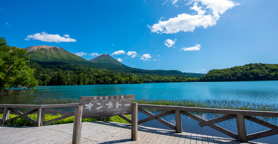 オンネトーは阿寒摩周国立公園内にある周囲2.5kmの湖。大自然に囲まれており季節や天候、見る角度によって湖面の色が青やエメラルドグリーンなどに変わる神秘的な湖です。特に明け方は、風が波を起こす前の湖面に周囲の景観が映り、幻想的な風景を見られることも…。オンネトー全体を見渡したいなら展望台がおすすめ。展望デッキからさらに約800mほどのトレッキングになりますが、眼下にオンネトー、その先には雌阿寒岳を望む絶景が待っています。また、オンネトー南部に位置する「オンネトー湯の滝」も見逃せません。高さ30mの滝はマンガン酸化物生成現象を地上で見られる唯一の場所。‟生きている鉱床”ともいわれ、世界的にも大変貴重な滝として知られています。
