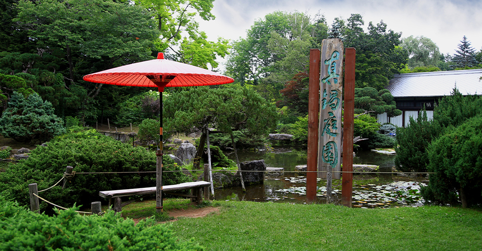 真鍋庭園は約2万5千坪(東京ドームの約1.8倍)もの広大な敷地を誇る庭園です。50年前から開放されているガーデンは日本庭園・西洋風庭園・風景式庭園という3つのテーマに分けられている回遊式。数千品種もの植物を見られる散策路は彩りや造形も豊かで飽きることがありません。日本初のコニファー(針葉樹)ガーデンとしても知られており、樹木生産やデザイン、管理などはすべて自社スタッフによるものです。また、ガーデン散策後の休憩にぴったりなカフェテラスも併設されており、ドリンクやスイーツと一緒にゆったりと余韻に浸れるほか、十勝を舞台にした朝の連続テレビドラマのロケセットが公開されているなど、見どころの多いガーデンとして賑わっています。