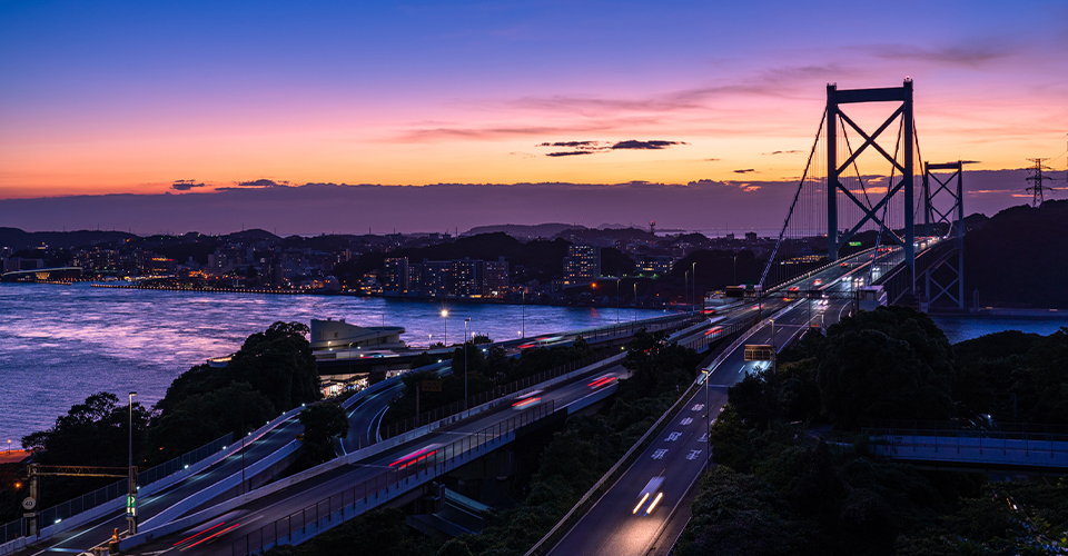関門海峡の最峡部、下関市壇之浦と北九州市門司区門司を結ぶ吊り橋。全長1068m、橋塔間712mは昭和48(1973)年の開通時点で日本および東洋最長の橋となり、その後開通する因島大橋や明石海峡大橋などの大規模橋梁の先駆けともなりました。また、海面から橋げたまでは満潮時でも約61mの高さが確保され、大型船舶でも余裕をもって航行できるようになっています。関門橋の撮影スポットは、下関、門司地区ともに複数あり、それぞれによさがありますが、おすすめは「火の山公園」。昼は日本海と瀬戸内海の大パノラマに調和するダイナミックな橋の姿を、夜はイルミネーションとライトアップにより浮かび上がる光の橋の姿が楽しめます。