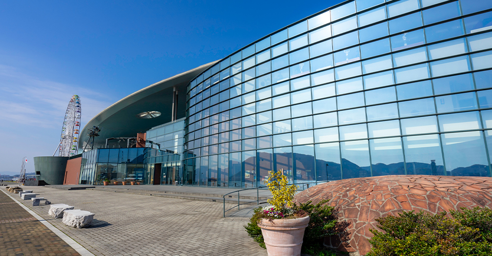 下関観光の中心のひとつで総水量約3200㎥、75の水槽に約550種、3万5000点の水生動物を展示する水族館。関門海峡を再現した関門海峡潮流水槽は約900㎥の海響館最大の水槽で、1日に4回潮の流れが変わる関門海峡の潮流とその環境で生活する魚たちの様子を観察できます。海底散策気分が味わえる海中トンネルや全長23mもの日本唯一のシロナガスクジラの全身骨格標本、100種以上のフグ目魚類の展示、目の前に関門海峡が広がるアクアシアターでのイルカとアシカのパフォーマンスなど、見どころは盛りだくさん。また、館内には「イルカの見えるレストラン」が併設されており、店内からイルカの撮影もできます。