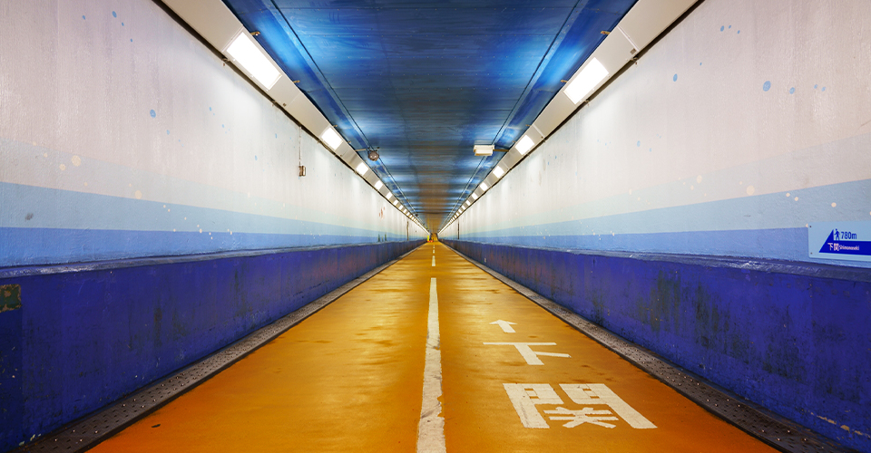 昭和33(1958)年に開通した、本州と九州を結ぶ全長3461.4mの海底トンネル。上部は車両専用、下部(780m)は歩行者専用に分かれた世界的にも珍しい二層構造となっています。下部の人道トンネルは、下関側が「御裳(みもすそ)川」停留所、門司側が和布刈(めかり)神社近くに入り口があり、所要時間は約15分。トンネル内部は、壁面に海藻や魚、天井に空のペイントがされており、楽しげな雰囲気になっています。県境は歩いてまたげるので、観光客の撮影スポットとしても人気。歩行者は無料で通行でき、地元の人の日常の移動手段のほか、雨・日除け対策が不要なウォーキング・ジョギングコースとしても利用されています。