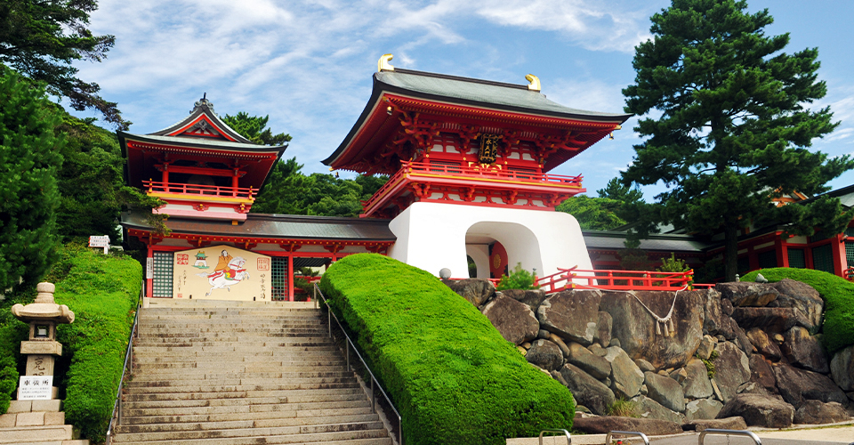 源平合戦・壇ノ浦の戦いで入水された幼帝・安徳天皇を祭った阿弥陀寺が前身で、明治維新後の神仏分離令により、阿弥陀寺が廃され「天皇社」となり、のちに「赤間神宮」に改称されました。壇ノ浦を望むように造営されており、ご利益は水難除け、家内安全、開運招福など。白壁に朱塗りの水天門は、安徳天皇を慰めるために竜宮城に見立てて建てられた竜宮造り様式。境内には、安徳天皇阿弥陀寺陵や平家一門の墓、小泉八雲の怪談『耳なし芳一』の木像が安置されている芳一堂、源平合戦の貴重な資料が展示されている宝物殿などがあり、歴史に興味がある方におすすめの観光地です。