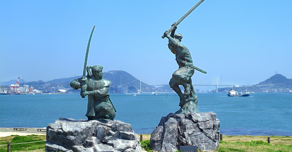 関門海峡に浮かぶ巌流島(正式名称は船島)は、面積約10.3万㎡、周囲約1.6kmのほぼ平らな無人島です。慶長17(1612)年4月13日に宮本武蔵と佐々木小次郎が決闘したことで知られており、負けた小次郎の流派「巌流」から名を取り「巌流島」と呼ばれるようになりました。現在は公園として整備され、1日約10便の連絡船(直行便)とチャーター便が運航しています。見どころは、佐々木巌流之碑や巌流島文学碑、武蔵・小次郎像、決闘を行った砂浜を再現した散策道・人工海浜など。大小さまざまな船が行き交う関門海峡を眺めながら、歴史に思いを馳せてみるのもおすすめです。※武蔵と小次郎の決闘については諸説あり