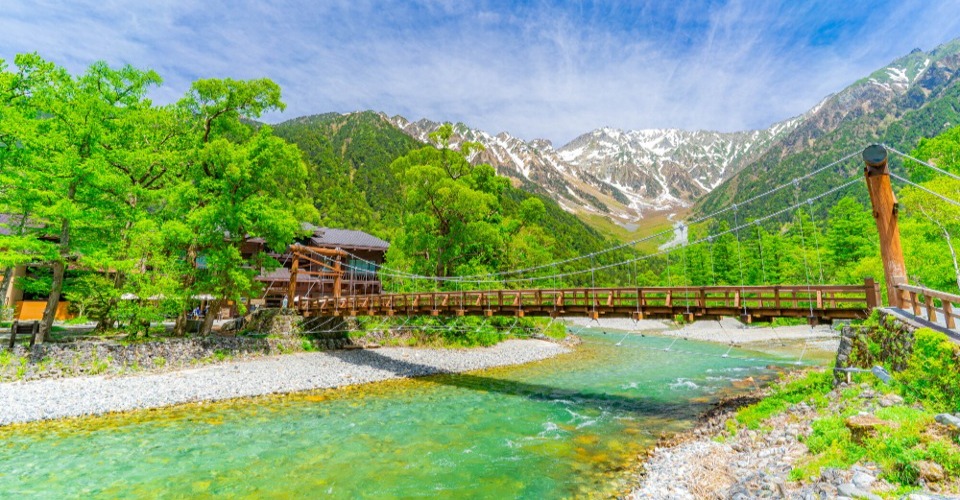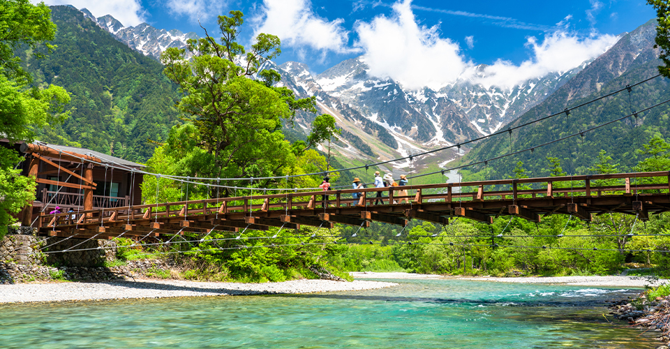 標高約1500mの山岳リゾート・上高地のシンボルでもある、梓川にかかる木製の吊り橋です。明治43(1910)年に吊り橋が造られた後、老朽化に伴い幾度も架け替えられており、現在の橋は平成9(1997)年に造られた5代目の吊り橋となります。橋の上からは、雄々しくそびえる穂高連峰や岳沢、透明度の高い梓川のせせらぎ、周囲にはケショウヤナギやカラマツなどの森が広がる絶好のビューポイントとして有名です。上高地バスターミナルから徒歩約5分。周囲にはホテルや温泉旅館、ロッジなどの多彩な宿泊施設があり、滞在して思い思いに過ごすのもおすすめです。