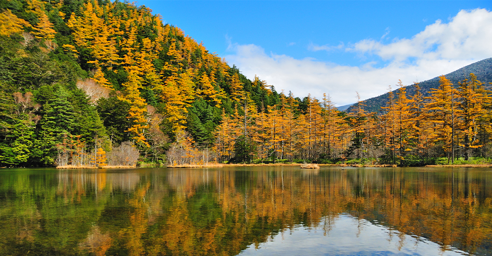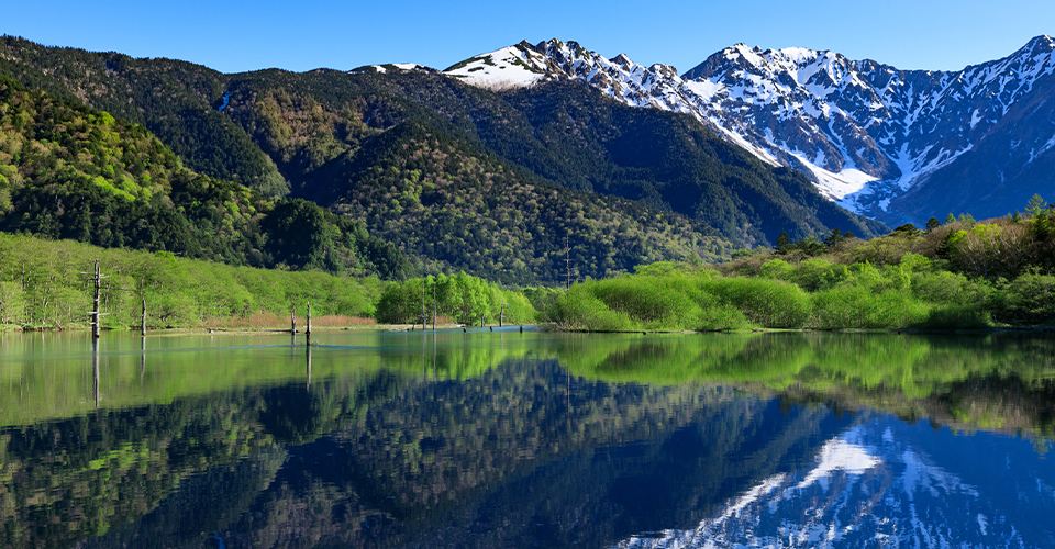 標高約1500m、長野県西部・飛騨山脈南部にある山岳景勝地です。3000m級の秀峰・穂高連峰をはじめ、活火山で荒々しい山容の焼岳、鏡のような水面が神秘的な大正池など、美しい自然が織りなすリゾートとしても人気で年間約120万人が訪れています。なかでも上高地のシンボルともいえる河童橋は、間近に雄々しくそびえる山と清冽なる梓川、ケショウヤナギやカラマツなどの森を一度に堪能できる絶好のビューポイントとなっています。春にはニリンソウやエゾムラサキなどのかれんな花々、秋には美しい紅葉など四季折々の自然風景も見どころのひとつ。また、上高地には初心者でも楽しめる3つのキャンプ場があり、ゆっくりと滞在して自然を満喫するのもおすすめです。
