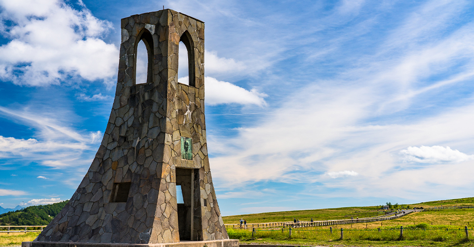標高約2034mの美ヶ原最高峰・王ヶ頭をはじめ、王ヶ鼻、茶臼山などを含めた標高2000m付近に広がる一帯の総称。長野県最大級の国定公園の一部でもあり、広大で美しい自然が残されています。周囲には箱根・彫刻の森美術館の姉妹館で約350点の野外彫刻を展示している「美ヶ原高原美術館」、美ヶ原高原のシンボルで霧鐘を備えた避難塔「美しの塔」などがあります。また、標高約2000mの日本一高い「道の駅 美ヶ原高原」では、食事や名産品の買い物を楽しめるほか、展望テラスから北アルプスを一望できます。近隣にある美ヶ原温泉や浅間温泉、乗鞍温泉、白骨温泉などの名湯も人気です。