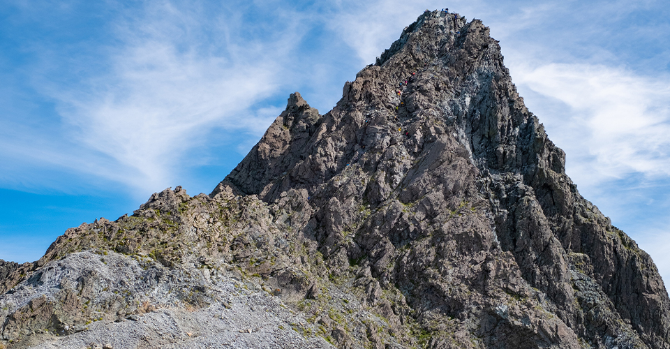 標高約3180m、1828年に播隆上人が初登頂して開山したといわれる天を突くような鋭い岩峰が特徴的な槍ヶ岳は日本で5番目に高い山であり、多くの登山者にとっては「一度は登りたい」憧れの山です。登山ルートはいくつもありますが、いずれも長距離で途中には切り立った稜線や足元の悪いガレ場が各所にあります。山頂への登山は5〜7時間程度のルートを2〜3日にかけて歩くことになるため、初心者の場合は上級者やガイドなどの引率者が必要とされます。春には深緑やかれんな山草や花々、秋には紅葉、そして雪に覆われる冬……、四季折々に多彩な姿を見せるさまも圧巻です。