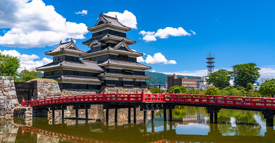 戦国時代に建造された「松本城」は、壁面の上部には白漆喰、下部は黒漆塗りの下見板で覆われており、黒と白のコントラストが特徴的な城です。また、現存する五重天守のなかでは日本最古の国宝としても有名です。天守は年間を通じてライトアップされており、夜には幻想的な雰囲気が漂います。城の周辺には松本市出身の芸術家・草間彌生の作品を展示している「松本市美術館」をはじめ、明治6年に開校された国宝「旧開智学校」、国内有数の古時計のコレクションを誇る「松本市博物館」などさまざまな見どころが点在しています。また、城下町の風情を残した周囲の通りには老舗の蕎麦屋や洋食屋、カフェなどがあり散策の合間に立ち寄ってみたいスポットです。