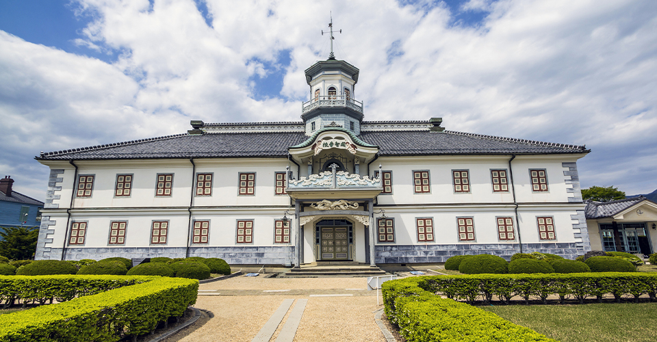 明治9年に地元の大工棟梁・立石清重が設計した小学校で、近代初期を象徴する和風洋風ともいえない不思議な「擬洋風建築」の代表として国宝に指定されています。正面には、八角の太鼓楼と寺のようなアーチの窓、青竜や2人のエンジェルが施され、西洋と日本の文化が入り混じったような文明開化を象徴するデザインになっています。当時は、現存校舎のほかに30室あまりの教室棟も設けられていて大規模な小学校でした。校内の観覧では授業で使っていた机や椅子、ノート代わりに使用されていた小型の黒板などが展示され、当時の様子を知ることができます。JR松本駅から徒歩25分、観覧料は大人400円、小人200円です(税込/2020年4月現在)。