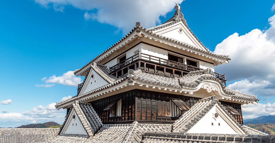松山のシンボル「松山城」は、市の中心部の勝山山頂に本丸が建つ、広大な平山城として有名。日本の「現存12天守」のうちのひとつである天守閣をはじめ、望楼型二重櫓の野原櫓や、二之丸から本丸にかけての登り石垣など、見どころの多さが特徴です。城跡は城山公園として整備・保護され、その全域が国の史跡に、21の建造物が重要文化財に指定されています。リフトやロープウェイでも往復できる本丸付近からは市街の絶景が一望でき、日没後の美しい夜景や天守閣のライトアップも見逃せません。お土産には、歴代城主の加藤家・蒲生家・松平家・久松家の家紋をあしらった登城記念符がおすすめ。近くにある「坂の上の雲ミュージアム」や「子規堂」などと併せて、松山の魅力をお楽しみください。