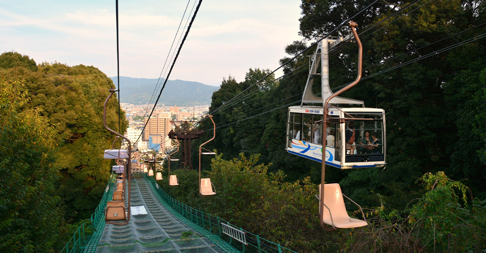 松山のシンボル「松山城」の本丸は、標高132mの山頂にあるため、歩いて上るには時間がかかり、少し大変。そこで便利なのが、山麓の東雲口から8合目の長者ヶ平までを一直線で結ぶ松山城ロープウェイです。運行は10分間隔で所要時間は約3分。並行してリフトも走っていて、いずれも東雲口駅1階で乗車券を販売しています。乗り場では、夏目漱石の小説『坊ちゃん』に登場するマドンナに扮した女性スタッフが袴姿でお出迎え。そのままロープウェイに乗車し、観光ガイドも勤めてくれます。車窓から見上げる松山城の天守閣や市街の眺望、沿線の豊かな自然は必見です。