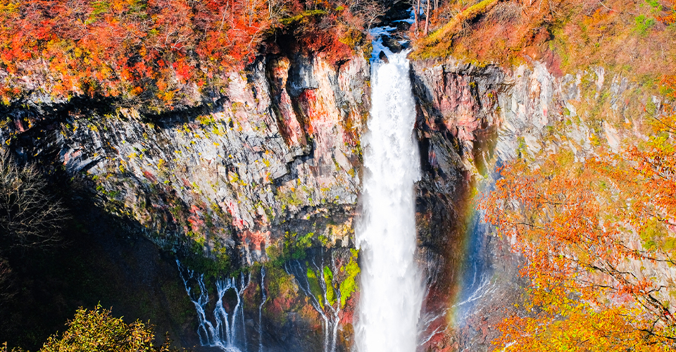中禅寺湖から流れ落ちる落差約97m、幅約7mの大瀑布。那智の滝、袋田の滝とともに日本三名瀑のひとつに数えられています。華厳滝エレベーターで約100m下の観瀑台まで行くことができ、滝つぼに近い位置から見る姿は迫力満点です。春はピンクのヤシオツツジ、夏は木々の緑、秋は錦絵のような紅葉が広がり、冬は滝つぼを囲むように流れる小滝が凍って美しい氷のシャンデリアをつくります。秋から春先は特に朝夕が冷え込むため、防寒対策は万全に。夏でもひんやりと涼しいので、羽織物があると安心です。2019年からは期間限定で夜のライトアップも行われ、初冬の新たな名物として注目されています。